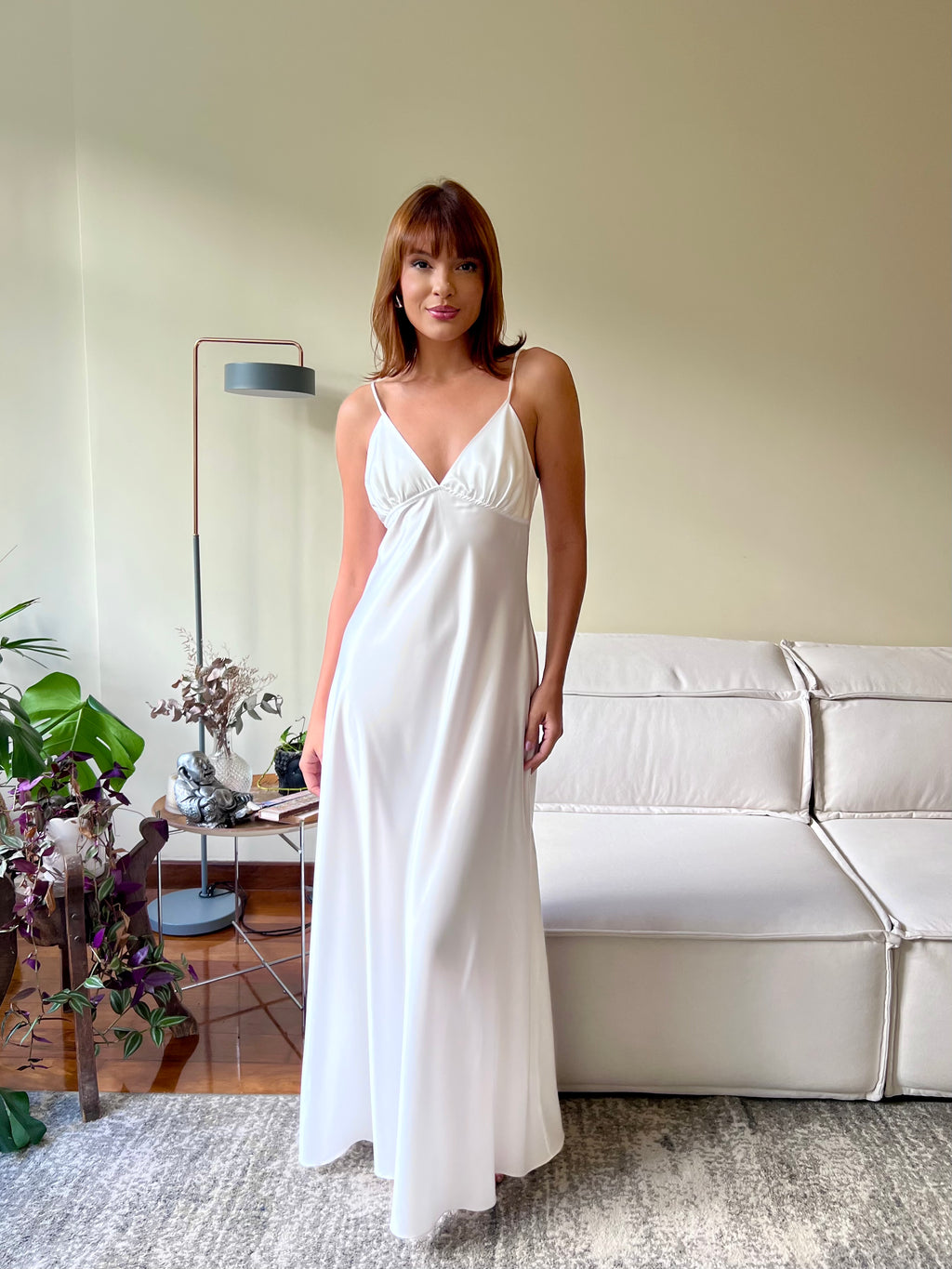 Camisola longa em cetim com toque de seda, extremamente macia e suave ao corpo. O decote em 'V' com recorte no busto e o comprimento longo proporcionam um visual elegante e delicado. Com caimento leve e confortável, é a escolha perfeita para noivas que buscam sofisticação e conforto. Robe vendido separadamente.