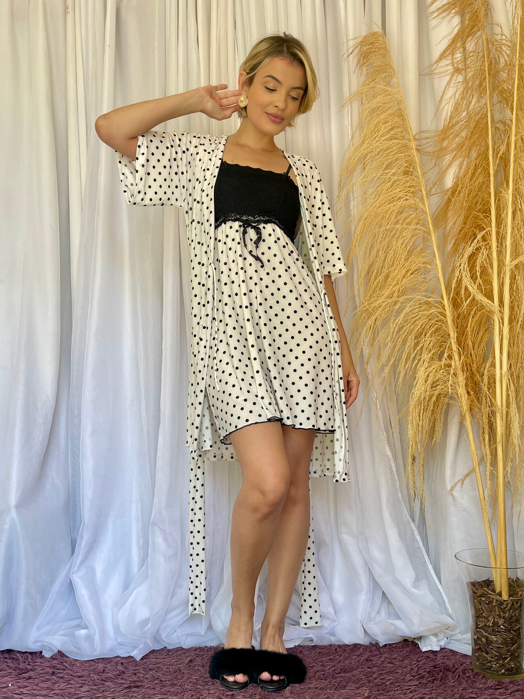 Camisola em tecido liganete (malha fria) com estampa de poá preto no fundo branco. Faixa de renda preta no busto, alça regulável e fitinha de cetim na cintura. Confortável e moderna.