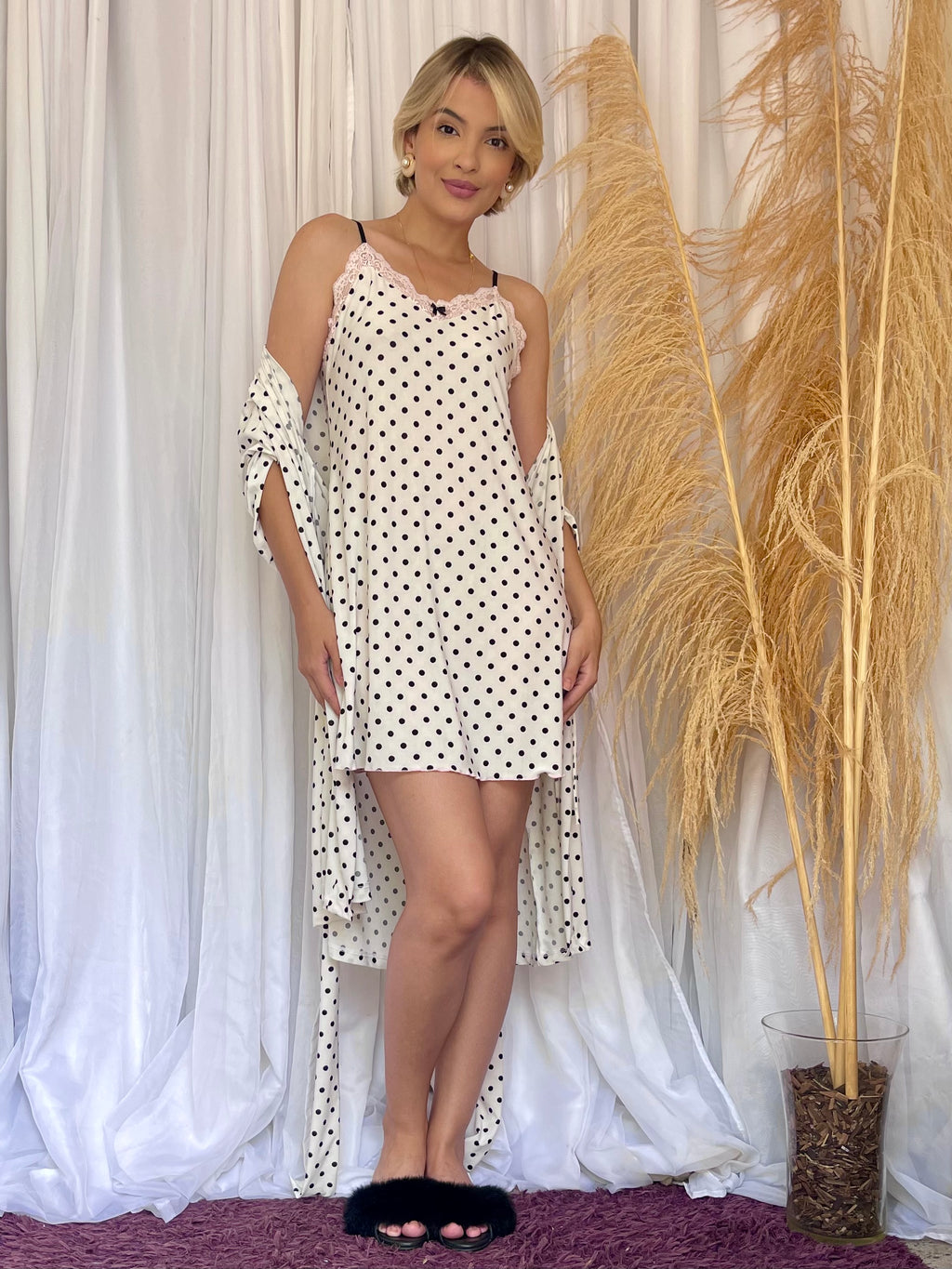 Robe de poá preto com fundo branco, amarração de rolotê interno e externo e faixa solta para acinturar.