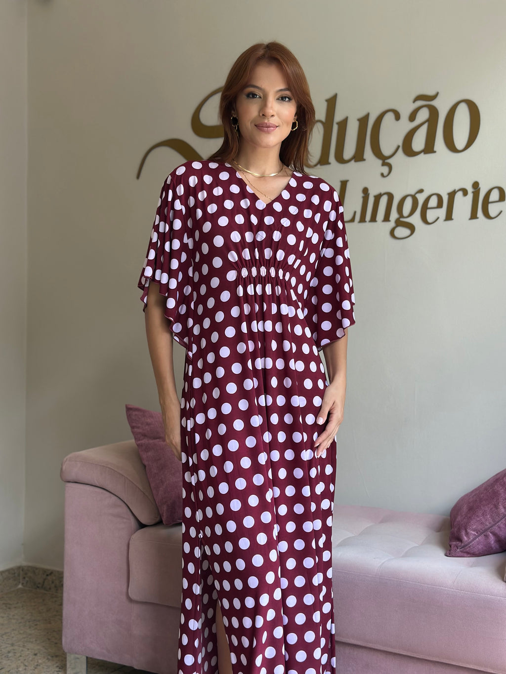 Kaftan em liganete leve que combina elegância e praticidade, com elástico abaixo do busto que valoriza a silhueta. O destaque vai para as mangas com babados, que dão movimento e delicadeza à peça. Ideal para passeios, momentos de lazer ou relaxar com charme.