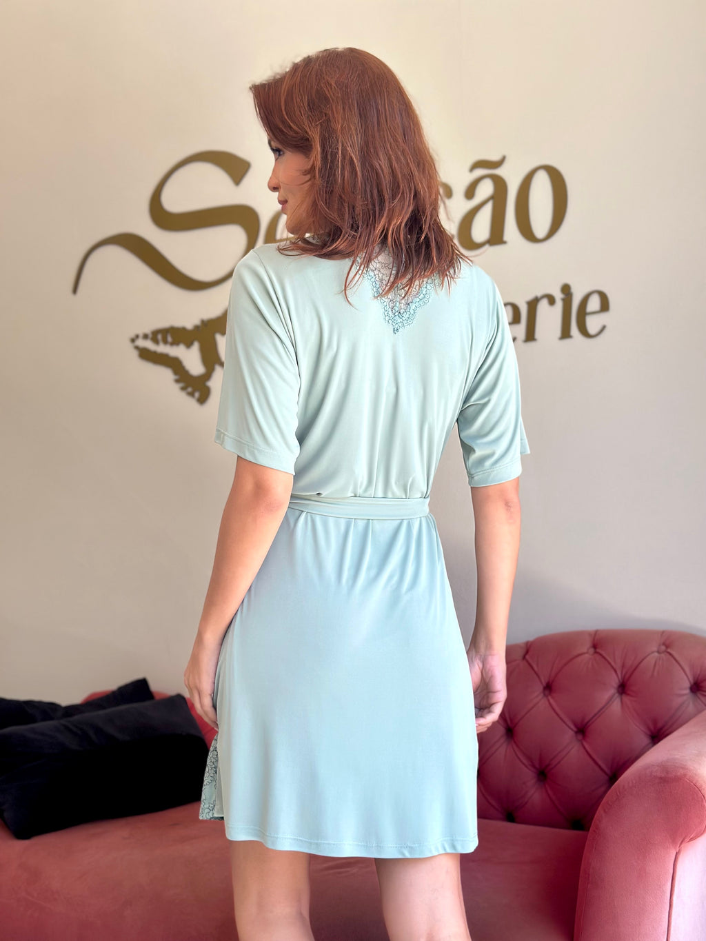 Elegância e conforto em um só robe! Confeccionado em liganete leve, este robe curto verde menta possui aplicações de renda verde com detalhes em preto, acrescentando charme e sofisticação à peça. A modelagem transpassada com faixa para acinturar garante caimento perfeito e conforto, tornando-o ideal para usar sobre camisolas ou como peça única em momentos de relaxamento.
