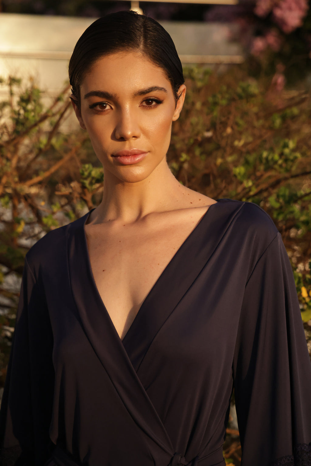 Robe curto em liganete azul marinho com toque leve e gelado, finalizado com delicada renda na barra das mangas. Sofisticado e atemporal, é perfeito para quem busca elegância e conforto em cada detalhe.