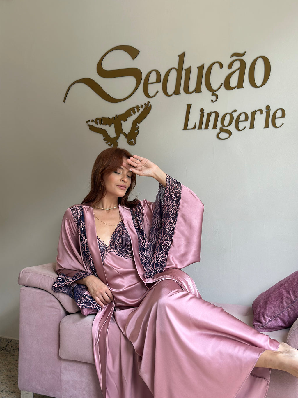 Roupão longo em seda tecnológica rose, com detalhes em renda azul com toques em rose, que conferem delicadeza e charme à peça. Leve, macio e elegante, proporciona conforto e um caimento sofisticado, ideal para momentos de relaxamento com estilo e sofisticação.