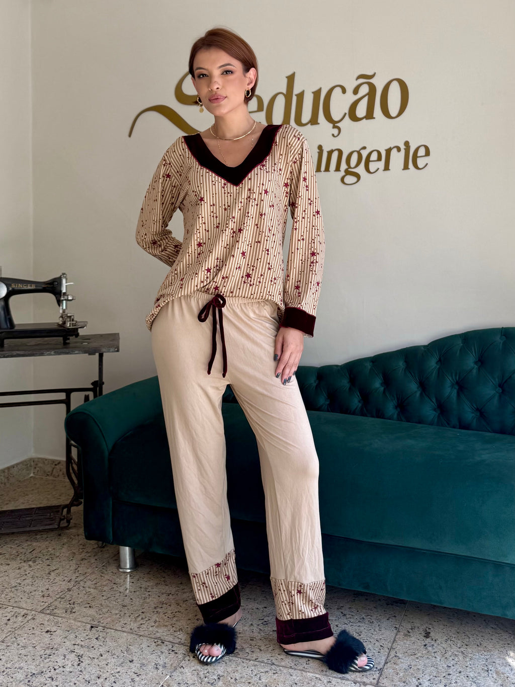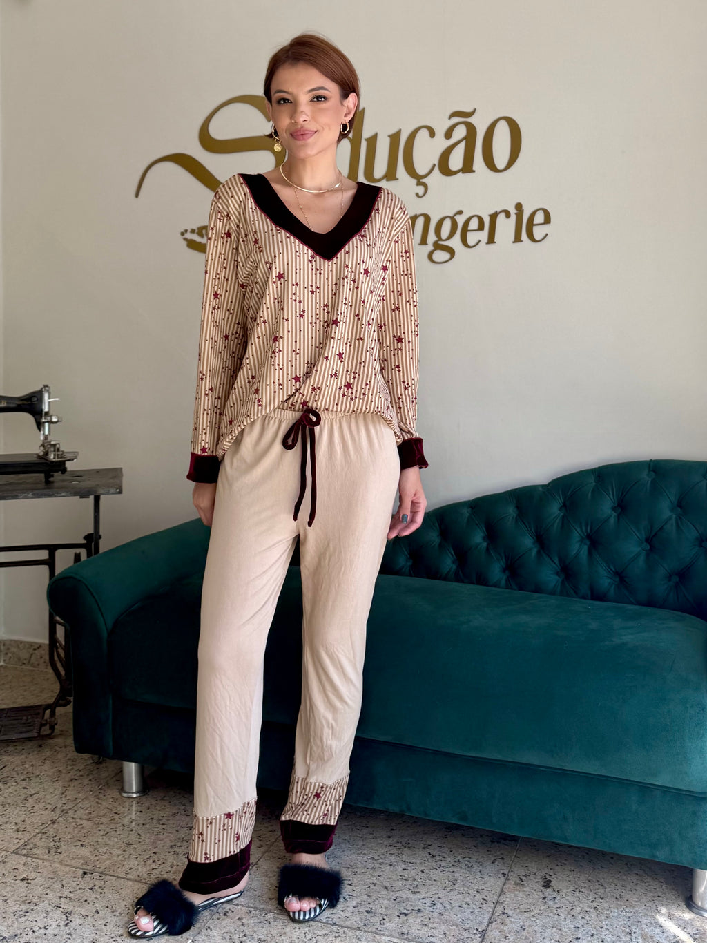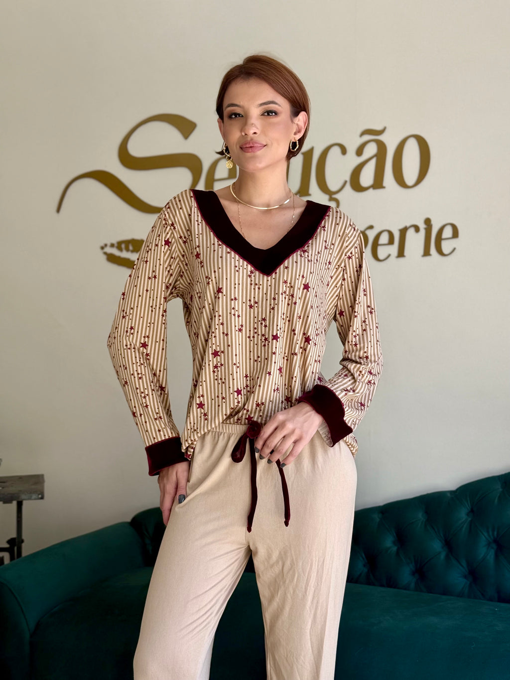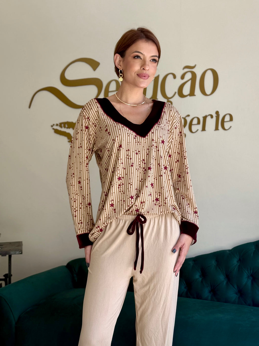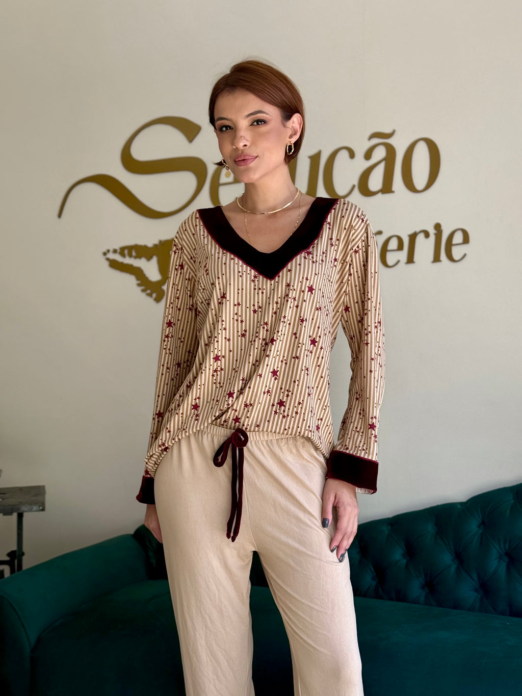 Pijama confececionado em tecido Suede. Blusa com toque macio estampado com listras verticais neutras e estrelas na cor vinho. Decote em V no veludo cor vinho que também aparece nos punhos, criando harmonia e sofisticação. Calça na cor beje com aplicação da mesma estampa da blusa na barra e acabamento em veludo na cor vinho. Pijama super confortável.