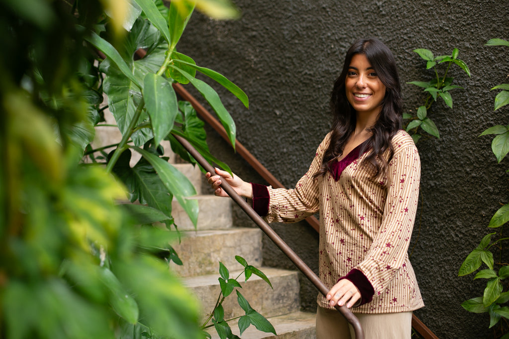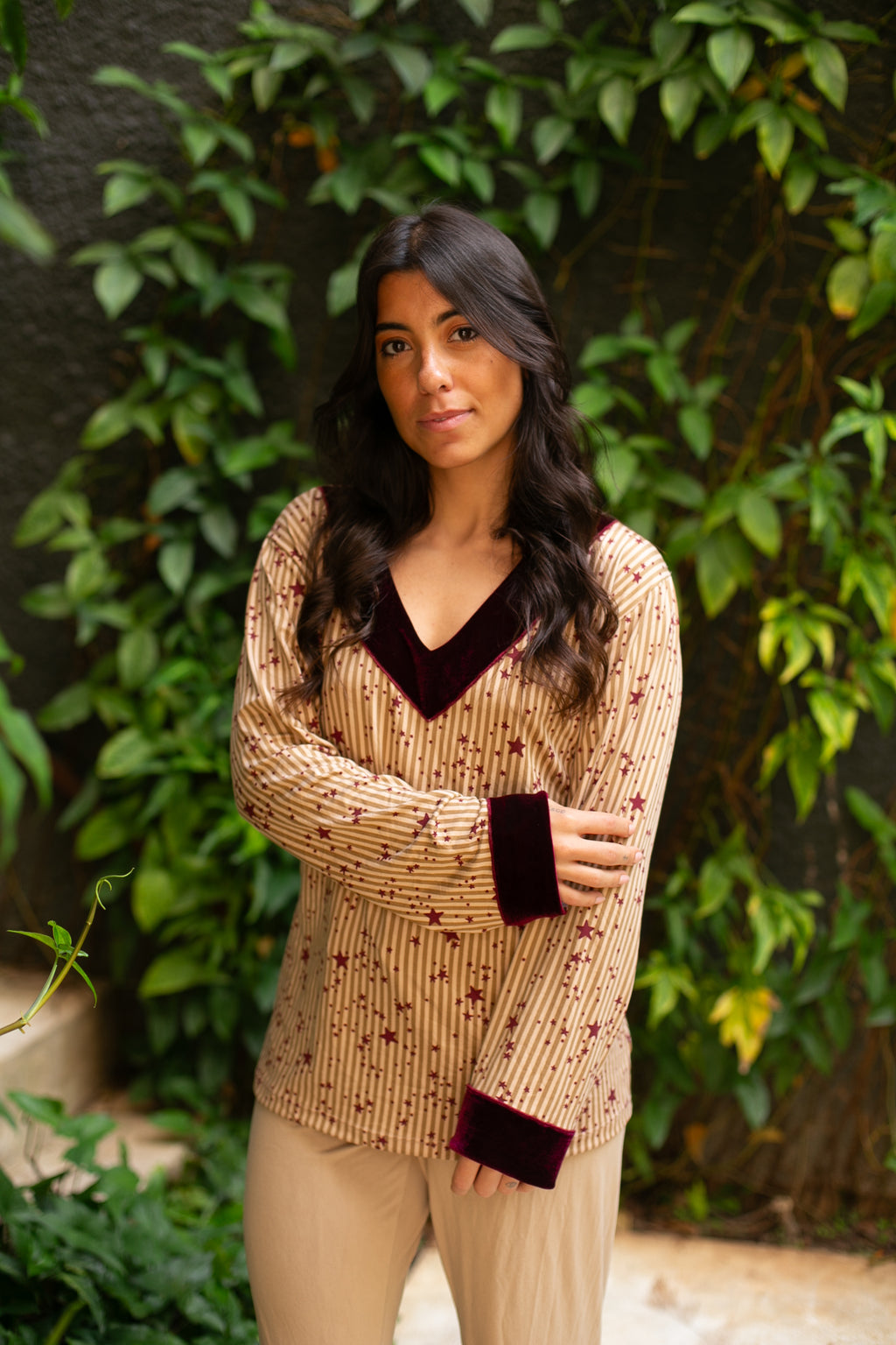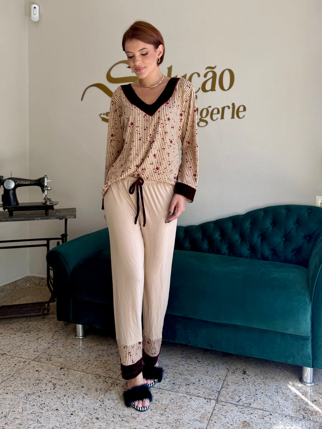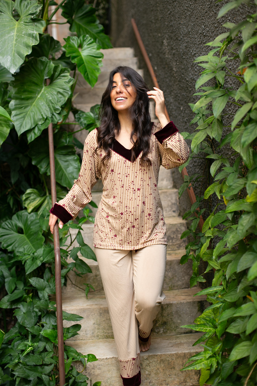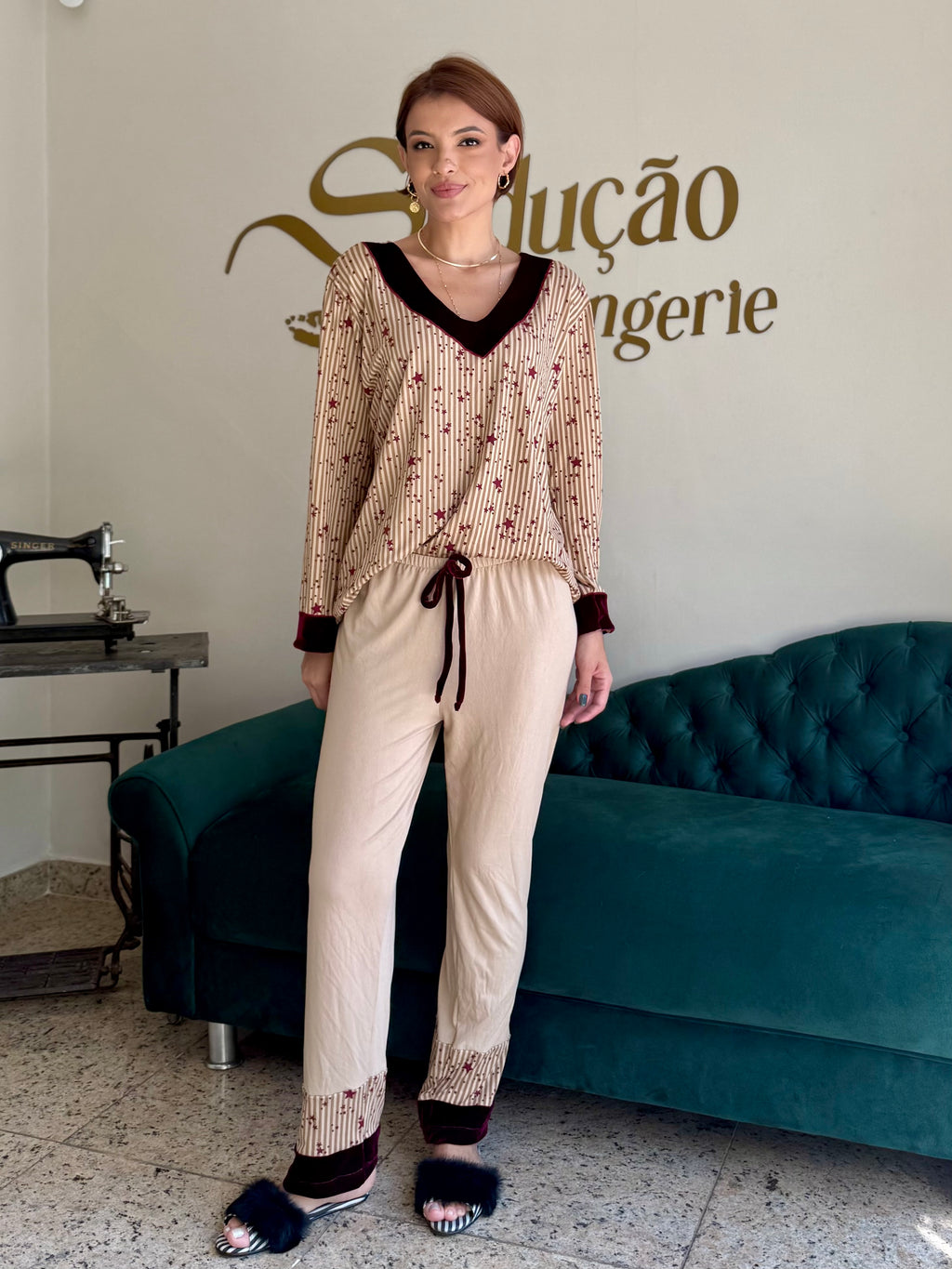 Pijama confececionado em tecido Suede. Blusa com toque macio estampado com listras verticais neutras e estrelas na cor vinho. Decote em V no veludo cor vinho que também aparece nos punhos, criando harmonia e sofisticação. Calça na cor beje com aplicação da mesma estampa da blusa na barra e acabamento em veludo na cor vinho. Pijama super confortável.